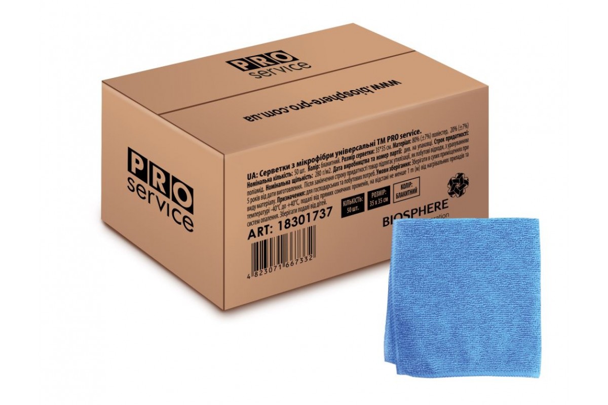 Універсальні серветки PRO service з мікрофібри за рахунок своєї структури проникають в найдрібніші пори і тріщини поверхні, що робить прибирання максимально ефективним. Щільність 280 г/кв.м і великий розмір 35х35 см забезпечують довговічність і зручність роботи серветок. Серветки не залишають розводів і ворсу, дозволяють проводити прибирання без застосування миючих засобів. Серветки рекомендується прати вручну або в автоматичній пральній машині при температурі не більше 60°C. Не рекомендується сушити на обігрівальних приладах. Колір блакитний. Склад: 80% - поліестер, 20% - поліамід.