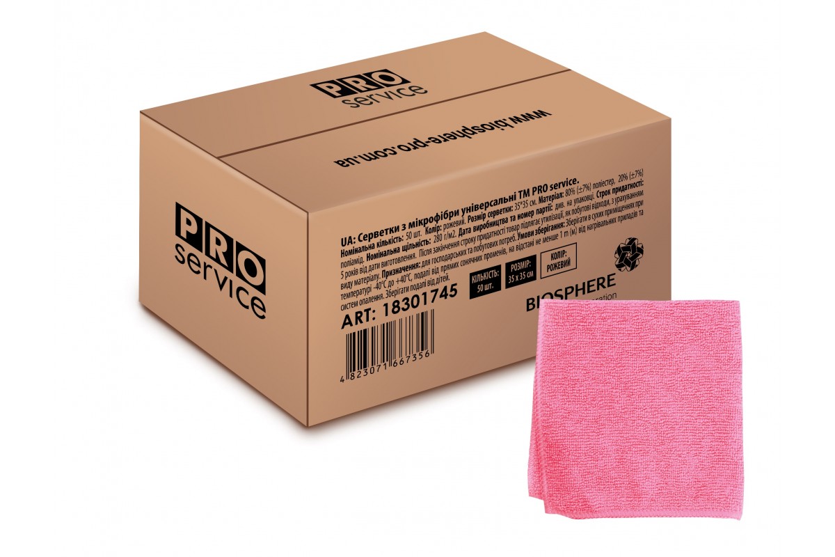 Універсальні серветки PRO service з мікрофібри за рахунок своєї структури проникають в найдрібніші пори і тріщини поверхні, що робить прибирання максимально ефективним. Щільність 280 г/кв.м і великий розмір 35х35 см забезпечують довговічність і зручність роботи серветок. Серветки не залишають розводів і ворсу, дозволяють проводити прибирання без застосування миючих засобів. Серветки рекомендується прати вручну або в автоматичній пральній машині при температурі не більше 60°C. Не рекомендується сушити на обігрівальних приладах. Колір рожевий. Склад: 80% - поліестер, 20% - поліамід.