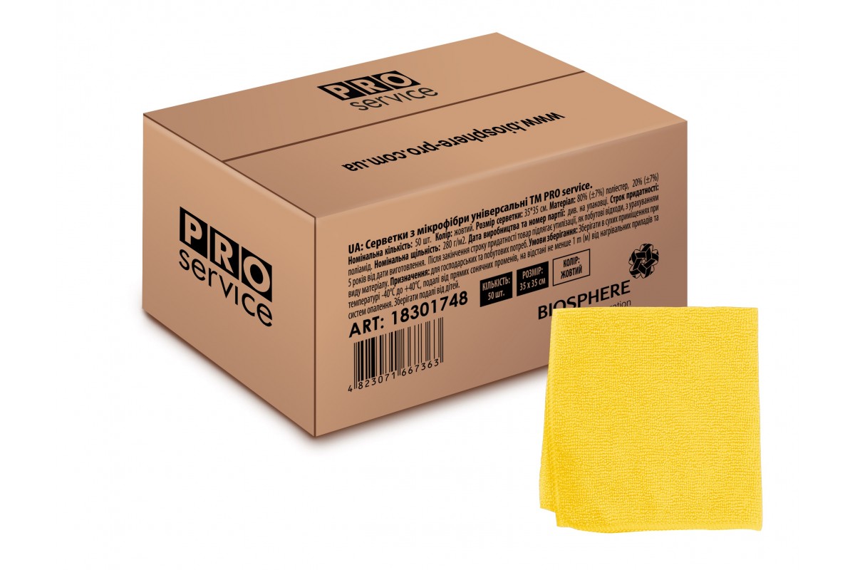 Універсальні серветки PRO service з мікрофібри за рахунок своєї структури проникають в найдрібніші пори і тріщини поверхні, що робить прибирання максимально ефективним. Щільність 280 г/кв.м і великий розмір 35х35 см забезпечують довговічність і зручність роботи серветок. Серветки не залишають розводів і ворсу, дозволяють проводити прибирання без застосування миючих засобів. Серветки рекомендується прати вручну або в автоматичній пральній машині при температурі не більше 60°C. Не рекомендується сушити на обігрівальних приладах. Колір жовтий. Склад: 80% - поліестер, 20% - поліамід.
