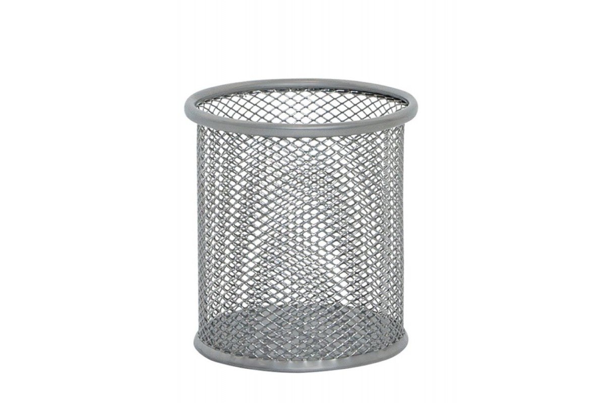 Настільний стакан для ручок виготовлений із металевої сітки з лаковим покриттям. Має круглу форму. Розміри: 90х100 мм. Колір сріблястий