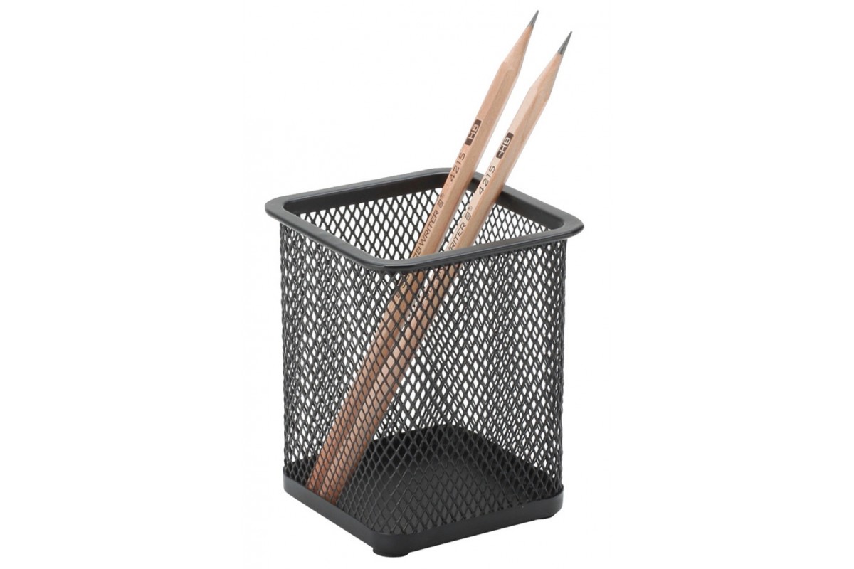 Квадрата підставка для ручок, олівців та іншого письмогово приладдя квадратна. Виготовлена з металевої сітки. Колір: чорний. Розмір: 80x80x100 мм.