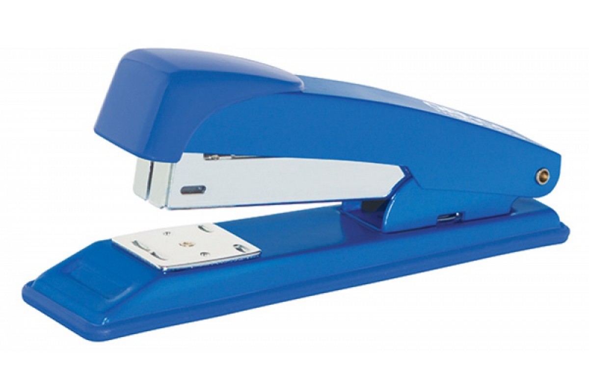 Металевий степлер №24-26/6, скріплює до 30 аркушів паперу. Корпус виготовлений з металу з пластиковою вставкою на важелі. Основа степлера - металева з пластиковою накладкою на підошві. Тип скріплення: закритий, відкритий, прямий. Скоба: № 24/6, № 26/6. Глибина закладки паперу: 60мм. Колір: синій.
