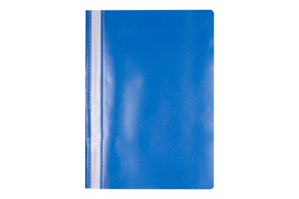 Економний, виготовлений з поліпропілену, м'який. Передня сторона прозора - товщина PP: 100 мкм. Задня сторона кольорова - товщина: 170 мкм. Вміщує близько 200 аркушів. Металеві шипи. Не підшивається. Змінна паперова бічна смужка, на якій можна писати з обох сторін. Кишеня, що дозволяє замінити смужку. Формат: А4. Розмір: 225x305 мм. Колір синій